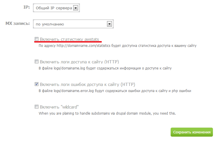 Для того что бы включить awstats для определенного домена следует выбрать Панель управления-Домены-Редактировать и выбрать опцию Включить статистику awstats и Включить логи доступа к сайту (HTTP)