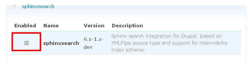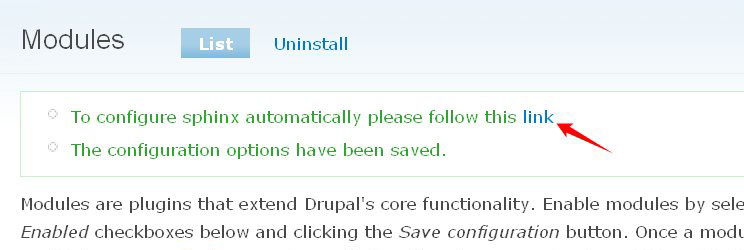 - После установки модуля на странице списке модулей появится сообщение с предложением перейти по ссылке. Если Вы перейдете по этой ссылке, настройка Sphinx произойдет автоматически.