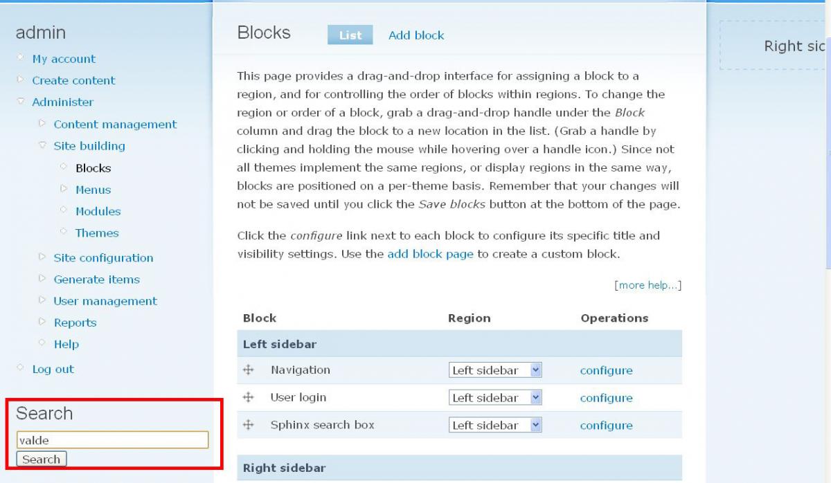 - Выведите на странице администрирования блоков admin/build/block блок Sphinx search box - с помощью этого блока пользователи смогут искать контент на Вашем сайте.