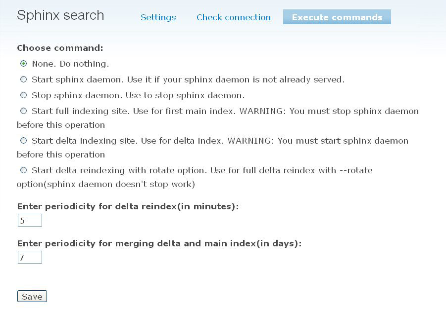 - Зайдите на страницу admin/settings/sphinxsearch/commands. Вы увидите следующую страницу. Ниже будет предоставлено объяснение к каждому пункту настройки.
